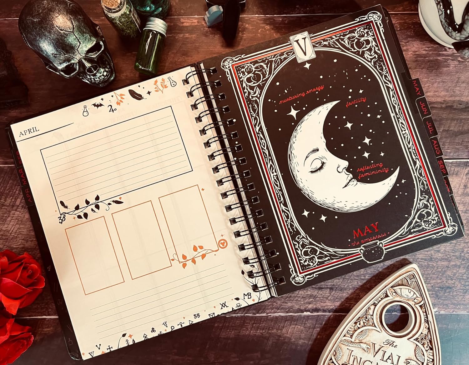 Each month features a unique tabbed page with tarot card-inspired artwork featuring crescent moons, spellbooks, dark florals, and other hauntingly magical designs.