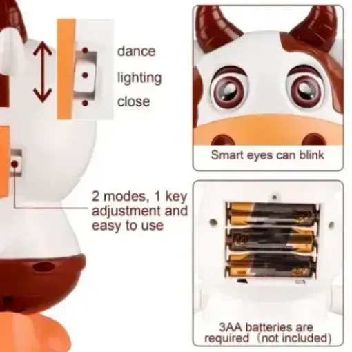 🐮 Material and Functions- The durable, shatterproof ABS plastic material shied ensure the musical cow in long lasting performance and sturdy construction. There are 2 modes for choose. You can choose the cattle to glow in a static state or dance to music and lights.