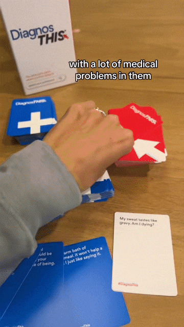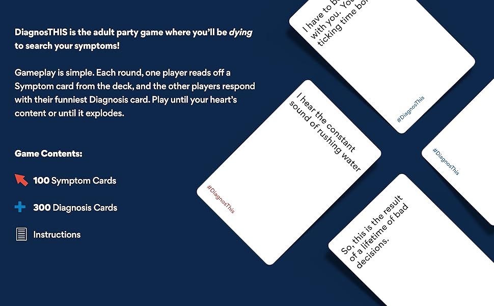 DiagnosTHIS is the adult party game where you'll be dying to search your symptoms! Gameplay is simple. Each round, one player reads off a Symptom card from the deck, and the other players respond with their funniest Diagnosis card. Play until your heart's content or until it explodes.
