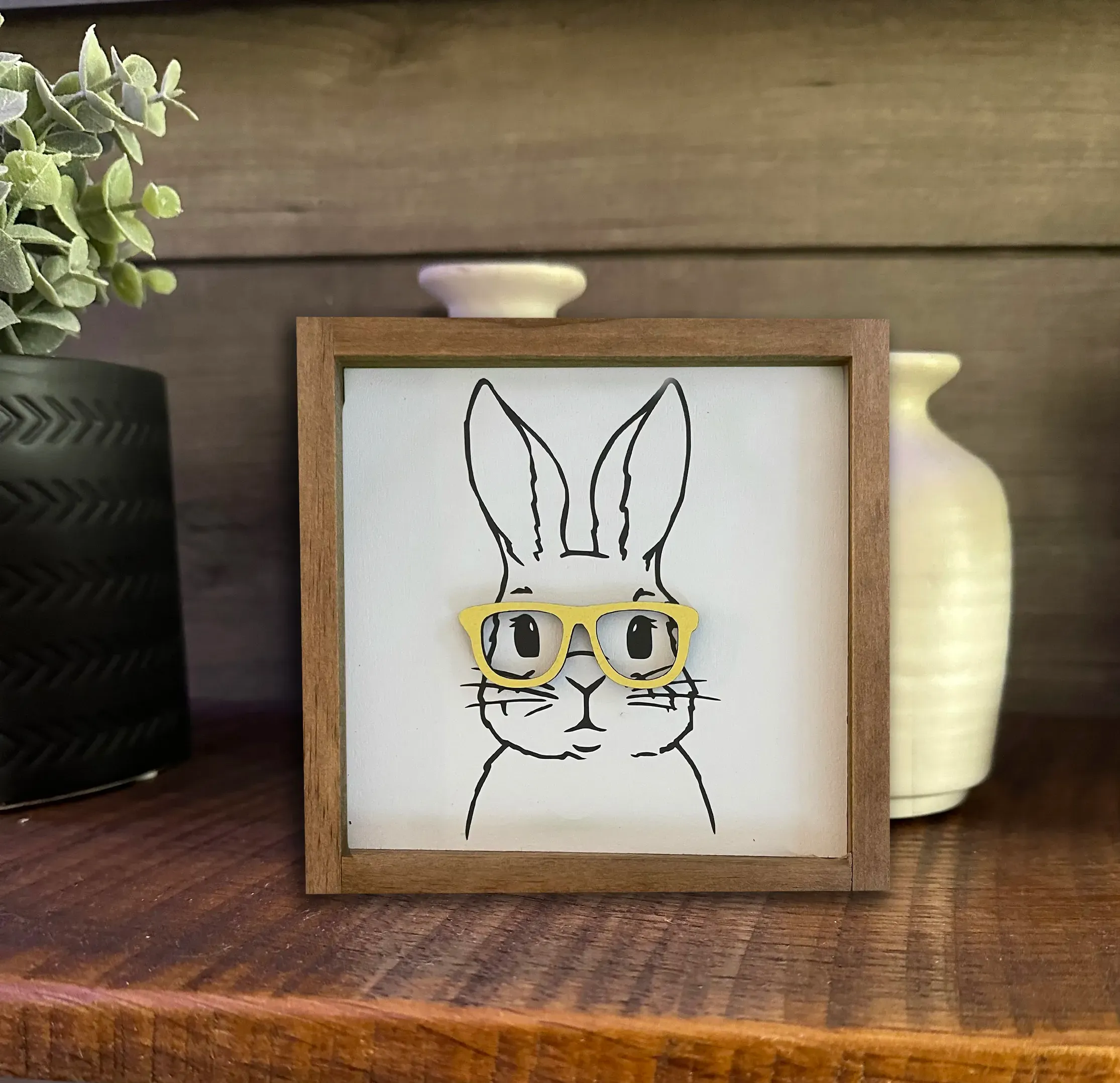 🐰Easter / Spring wooden signs Hello spring, Happy Easter and Peter cottontail are vinyl signs.The bunny with glasses are a combination of vinyl and the glasses are laser cut and added for a 3d effect.Frame is stained special walnut.