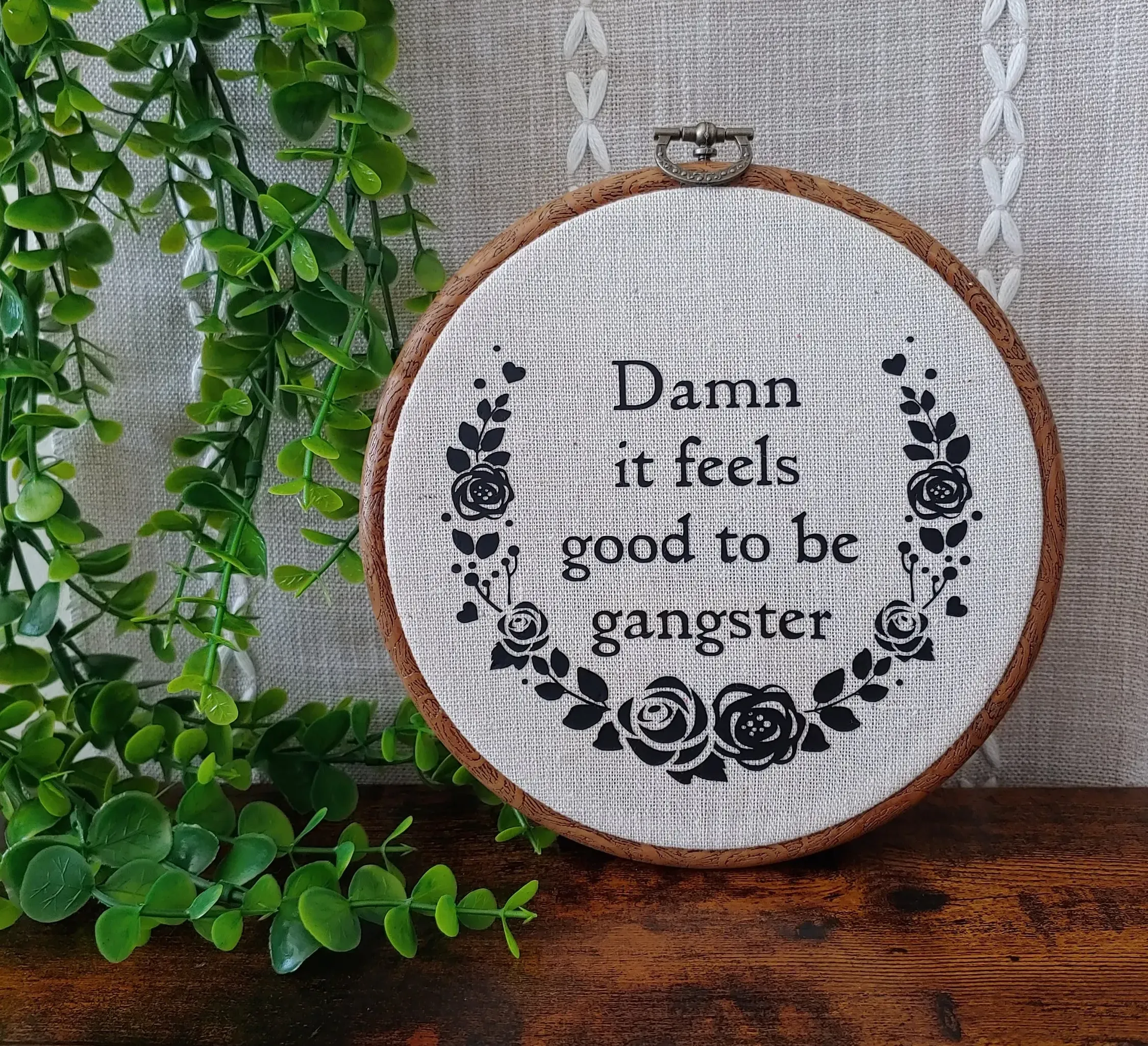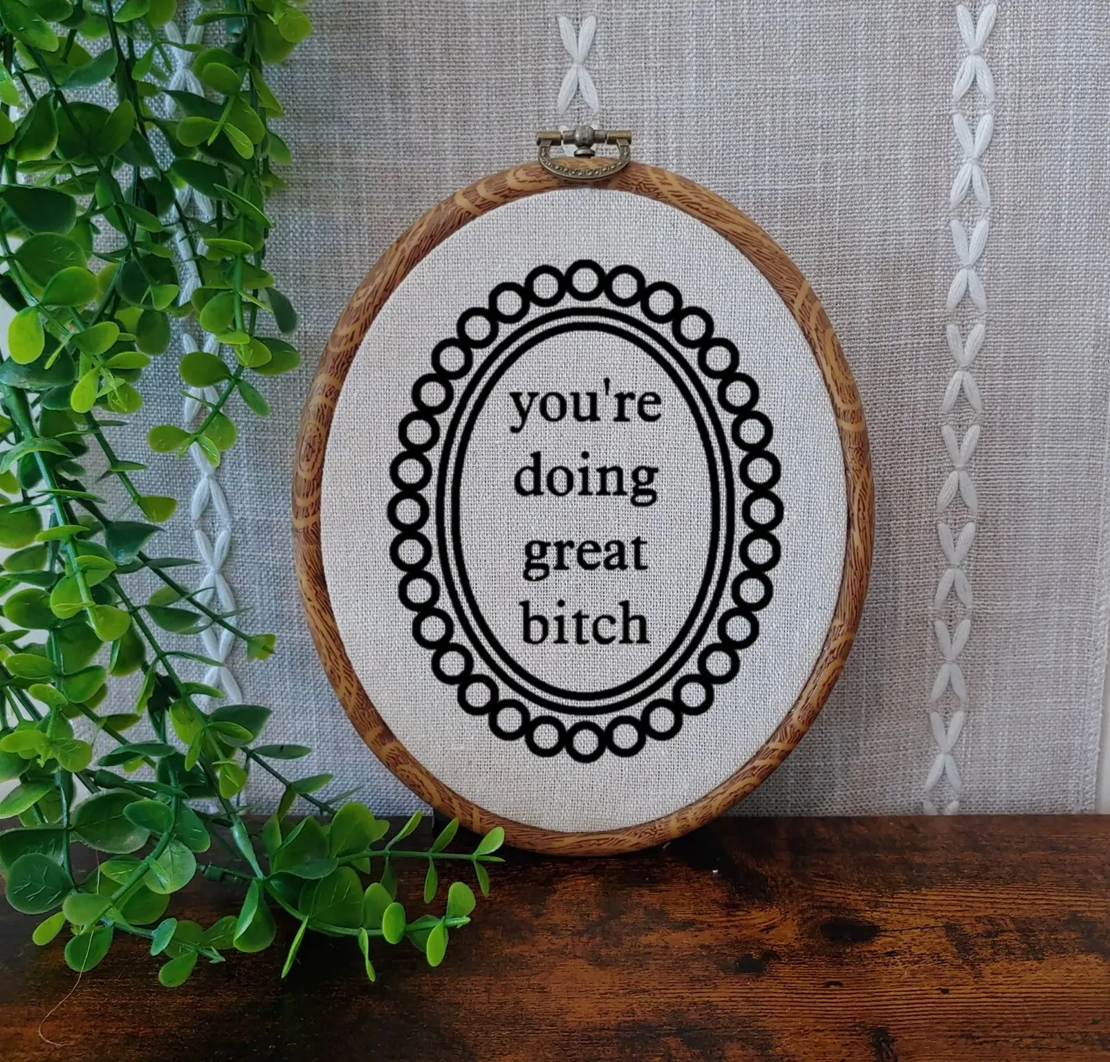🎁The image is printed with black permanent non-toxic ink and set on your choice of light or dark cream fabric. With wood grain style frame.