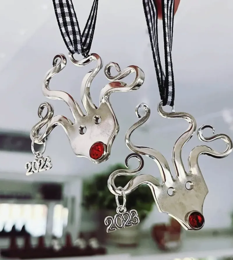 ✨This ornament is made from a vintage fork and hand stamped with cute little eyes made from dots, commas or dashes.