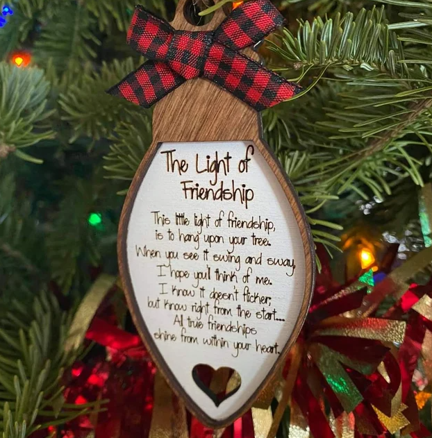 🎁This little light of friendship, is to hang upon your tree. When you see it swing and sway I hope you'll think of me. I know you'll think of me. I know it doesn't flicker, but know right from the start....All true friendships shine from within your heart.✨