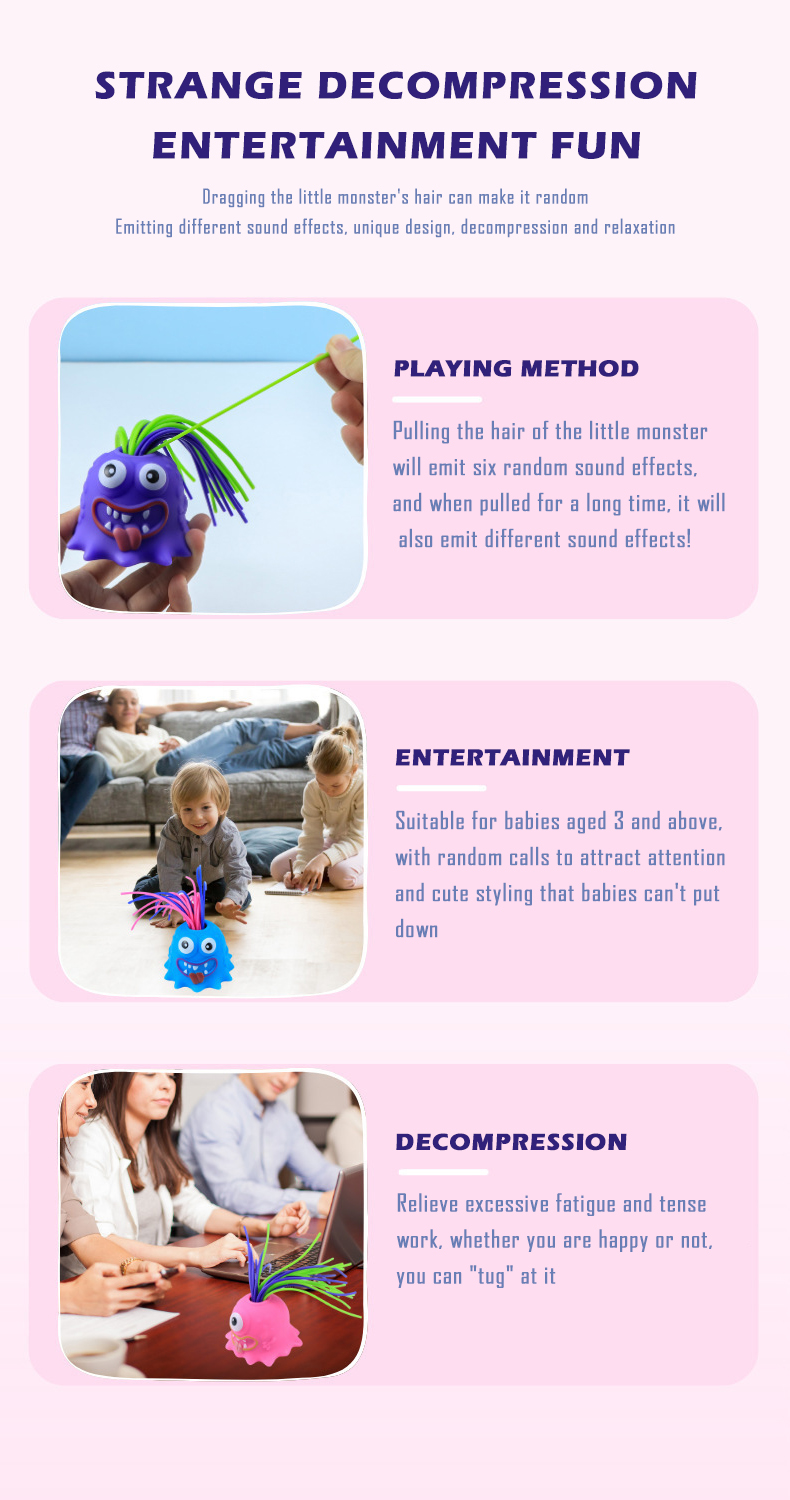 Fun interactive screams will capture the attention of girls and boys alike. Even adults won't be indifferent! These charming guys can make monster-like noises just by pulling their hair. Gather all your friends and set your own rhythm for the Monster Song!